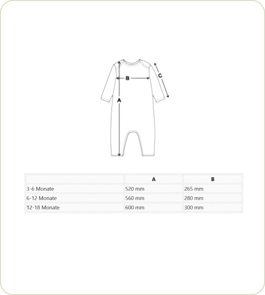 Der Stoff liegt fest in der Hand, ohne schwer zu wirken, und schmiegt sich an wie ein Lieblingsstück. Die nickelfreien Druckknöpfe an Beinen und Schritt erleichtern das Umziehen, wenn der Abend lang und die Äuglein müde sind.