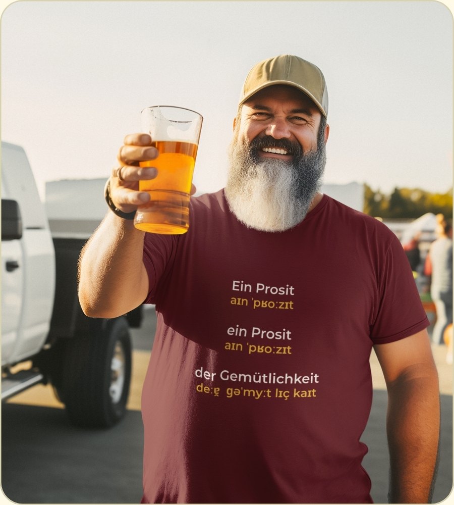 Du kennst die Szene: Die ersten Takte erklingen, alle greifen zum Maßkrug und das ganze Festzelt stimmt die Bayerische Festhymne an. Mit der Lautschrift auf diesem Shirt fällt das Mitsingen auch internationalen Gästen leicht – von den ersten Silben an klingt’s gscheid.